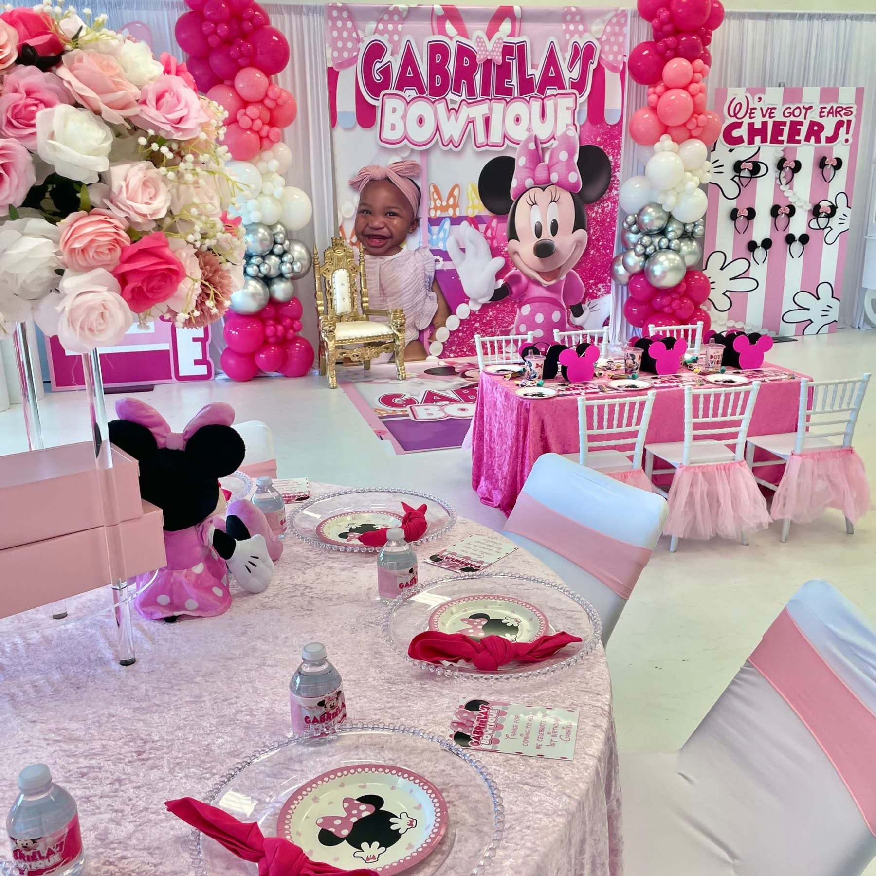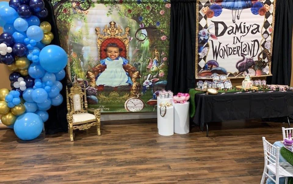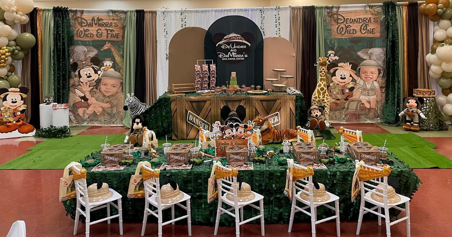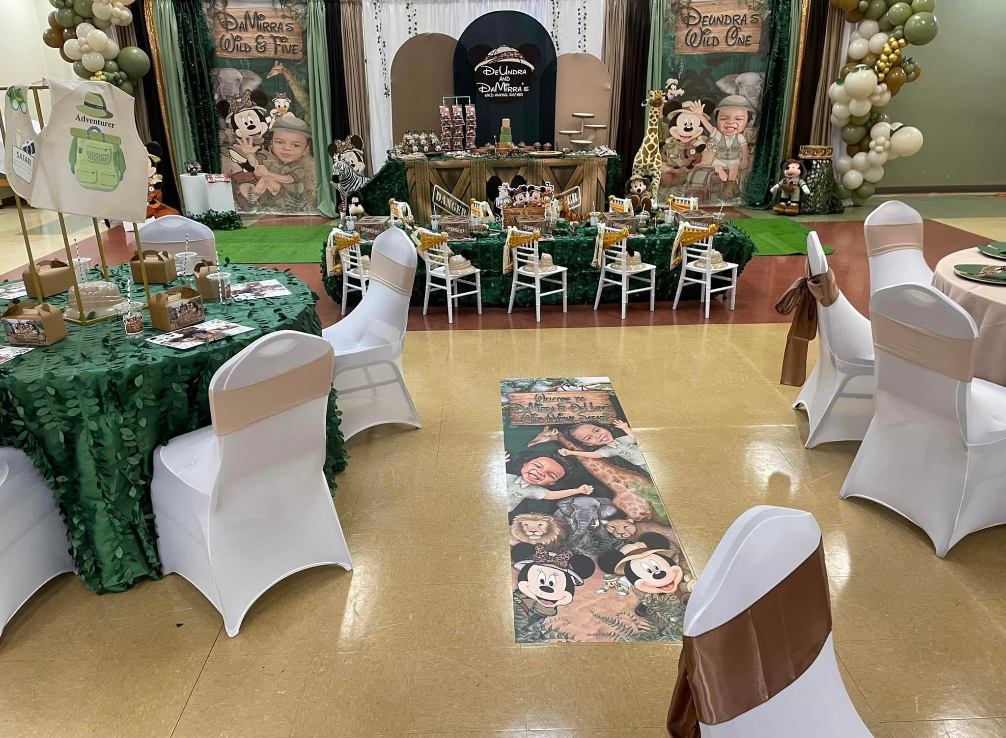 (Up to 25 guest, 10 kids, 4x8 or 8x8 backdrop, (2) Balloon columns or (1) balloon garland, full event decor, 1/2hr Mascot, chiavari chairs)