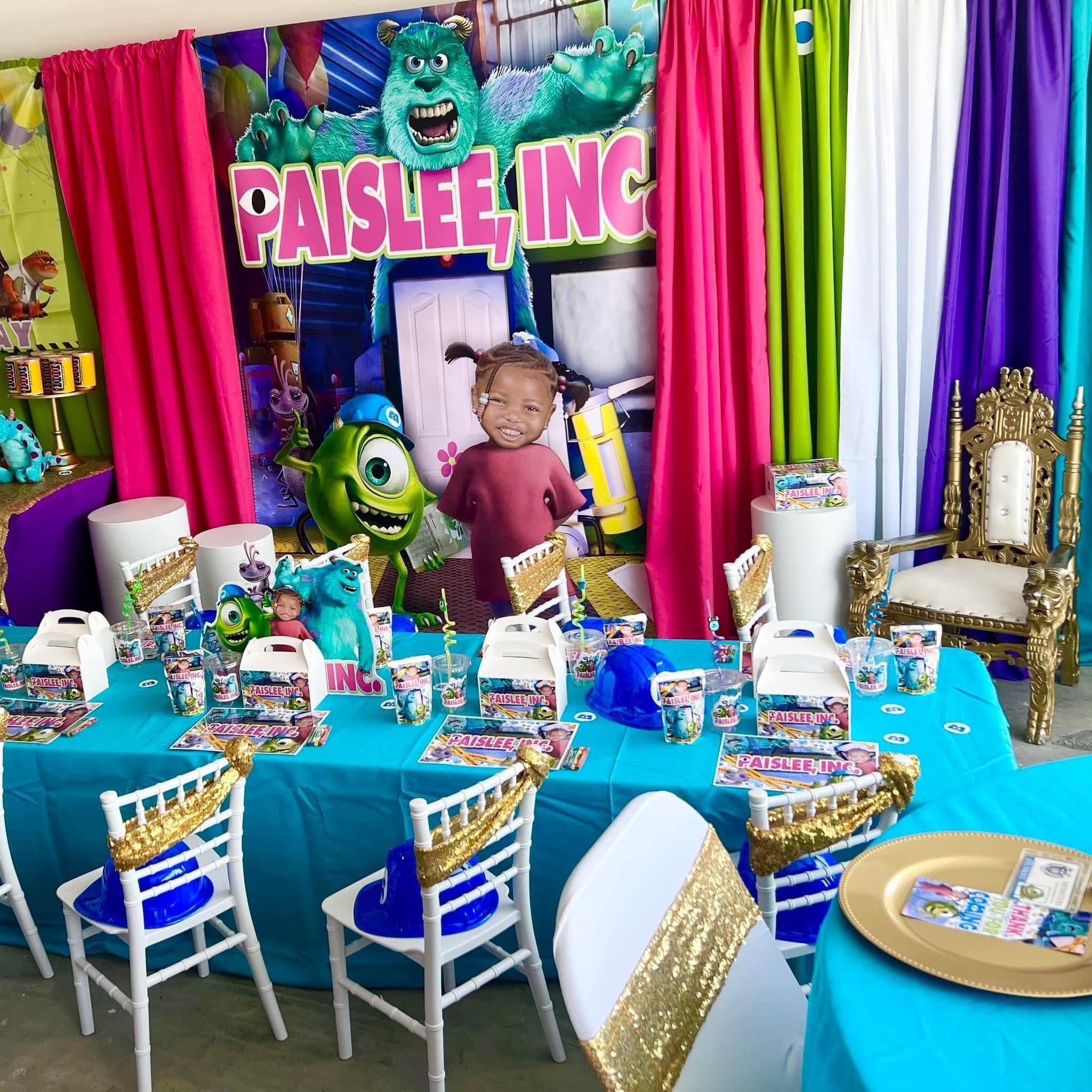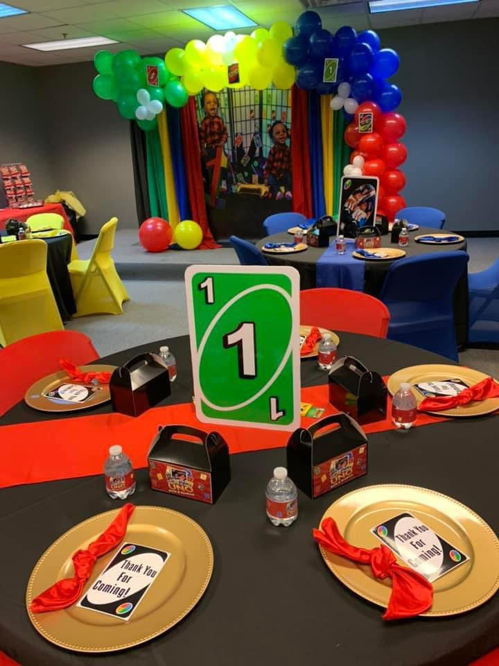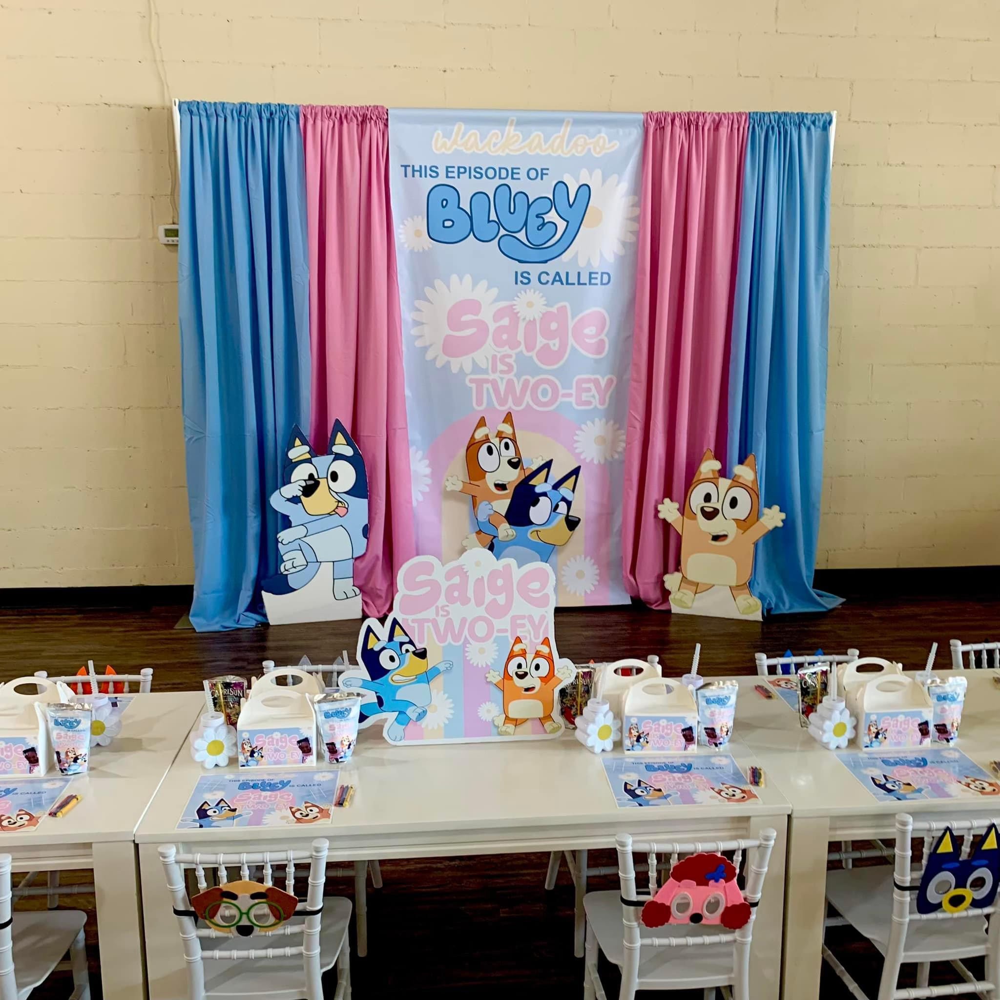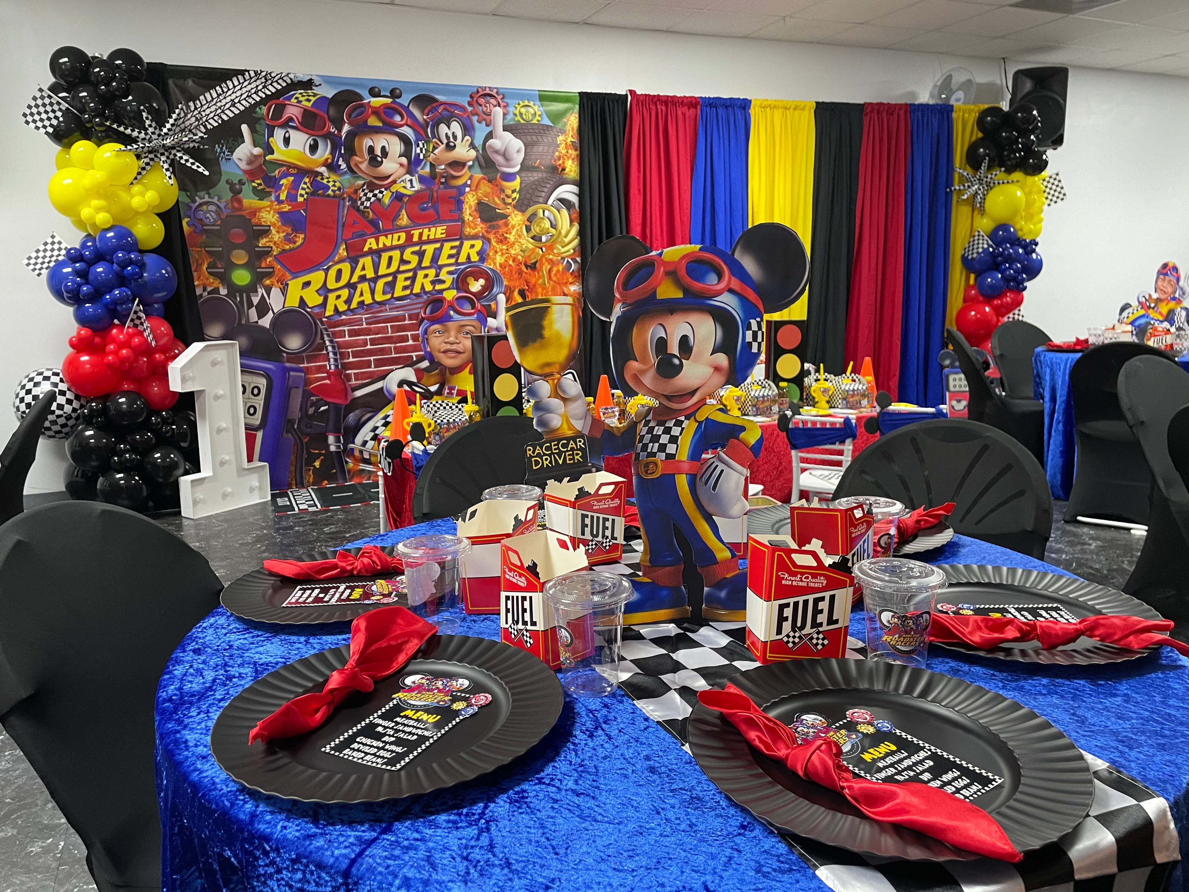(Up to 25 guest, 10 kids, 4x8 or 8x8 backdrop, (2) Balloon columns or (1) balloon garland, full event decor, 1/2hr Mascot, chiavari chairs)