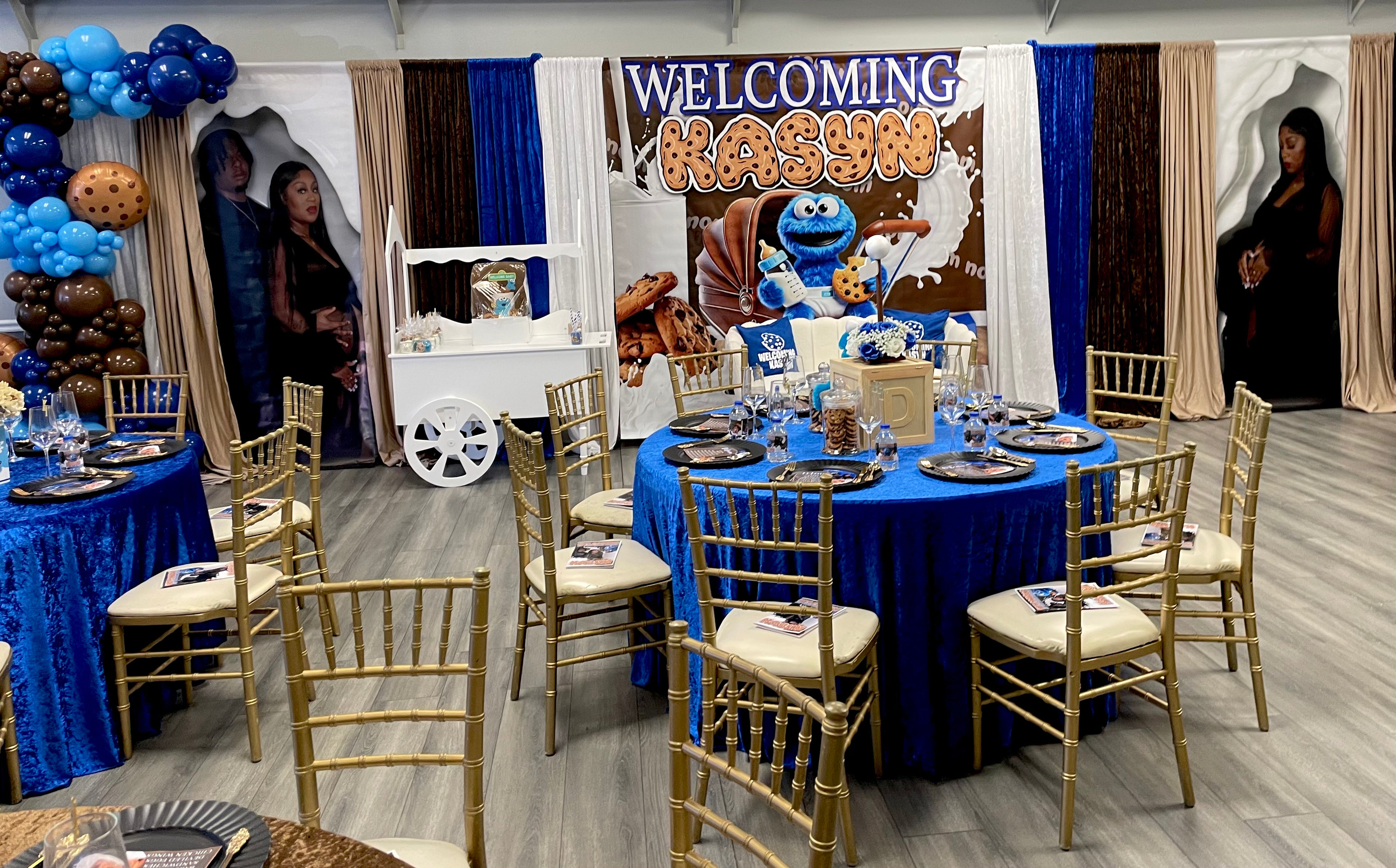 (Up to 50 guest, (2) Balloon columns or (1) balloon garland, full themed event set up, welcome sign, (2) throne chairs or loveseat, chiavari chairs, up to 6 marquee letters or "BABY" Marquee letters, treat wall or cart, floor runner/wrap, gift table, (3) custom backdrop panels or (1) 8x8 and (2) 4x8 backdrops)