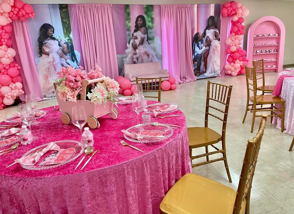 (Up to 25 guest, (2) Balloon columns or (1) balloon garland, chiavari chairs, "BABY" Marquee letters, treat cart, floor wrap/runner, Love seat, custom pillows, gift table, (3) custom backdrop panels)