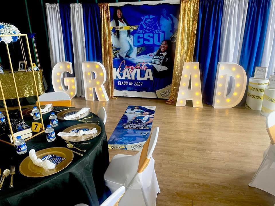 (Up to 35 guest, full event set up, (3) custom backdrop panels or (1) 8x8 + (2) 4x8 backdrops, welcome sign, centerpieces, (2) Balloon columns or (1) balloon garland, throne chair, "GRAD" marquee letters, treat cart or wall.)